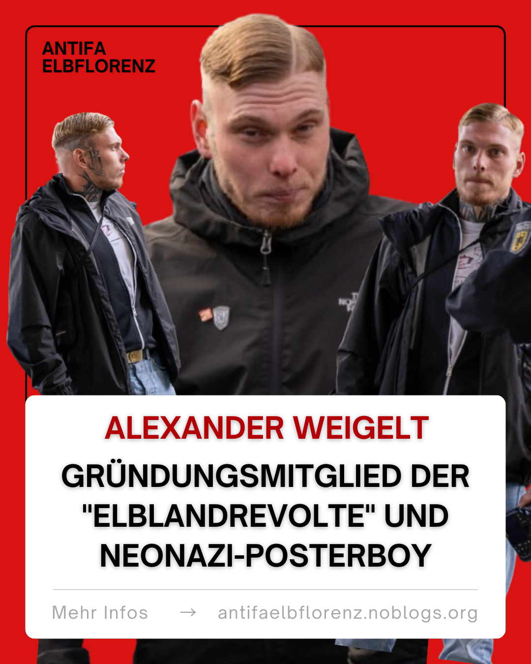 Alexander Weigelt zählt seit Ende 2023 zu den umtriebigsten jungen Neonazis im Raum Dresden. Der aus Meißen stammende Mitte Zwanzigjährige gehört zu denjenigen Kadern, die seit der Gründung der Elblandrevolte am 03. Februar 2024 als Stützpunkt Dresden der Jungen Nationalisten (JN) Teil der Gruppierung sind und immer wieder prominent in Erscheinung treten. Weigelt, Spitzname „Kixy“, gehört damit zu den älteren und erfahrenen Akteuren der Elblandrevolte. 2024 war er noch bei nahezu allen Aktionen und Demos der Gruppierung zu sehen, etwa bei den Anti-CSD-Protesten oder beim Neonazi-Aufmarsch um den 13. Februar in Dresden. Mittlerweile tritt er öffentlich weniger in Erscheinung, spielt dafür aber im Hintergrund eine wichtigere Rolle.So ist er vor allem bei bundesweiten Treffen der Jungen Nationalisten (JN) regelmäßiger Gast. Dort nahm er an Aktionen wie Orientierungsmärschen oder den in regelmäßigen Abständen stattfindenden Festen und Vernetzungstreffen teil. Damit fungiert er für die Elblandrevolte als ein Scharnier in die bundesweite Szene und tritt für die JN als Posterboy udn Werbegesicht auf. Eine Ursache dafür ist sicher seine Beziehung zu Lilly Baginski, besser bekannt als „Anio“. Diese ist als neonazistische Influencerin das weibliche Aushängeschild der bundesweiten JN und lebt in Rheinland-Pfalz. Seit dem Sommer 2025 treten sie als und Weigelt als Paar öffentlich in Erscheinung und sind so etwas wie das Neonazi-Traumpaar der Szene. Alexander Weigelt bespielt neben seinem im engeren Sinne neonazistischen Engagement weitere Felder. So ist er einerseits in der Fußball-Ultra-Szene verankert und gehört zum neonazistischen Teil der Fan-Szene des Fußball-Clubs MSV Meißen. Andererseits sprüht Alexander Weigelt in Dresden und Umgebung Graffiti. Dabei malt er entweder Propaganda-Pieces für die Elblandrevolte oder taggt seinen Spitznamen „Kixy“ oder den seiner Neonazi-Gruppe. Seit neuestem malt er „dubios“/“dubioser sport“ Pieces. Diese waren z. B. in der Dresdner Flutrinne zu finden. Beruflich ist Alexander Weigelt, der mittlerweile in Radebeull wohnt, als Gerüstbauer bei der Meißner Firma „Gerüstbau Rony Schlehahn“ tätig. Die Firma kann per Mail an rony.schlehahn@gmail.com darüber informiert werden. Wir denken, Weigelt sollte als einer der zentralen Figuren der Neonazi-Organisation Elblandrevolte auch berufliche Konsequenzen erfahren und entlassen werden.