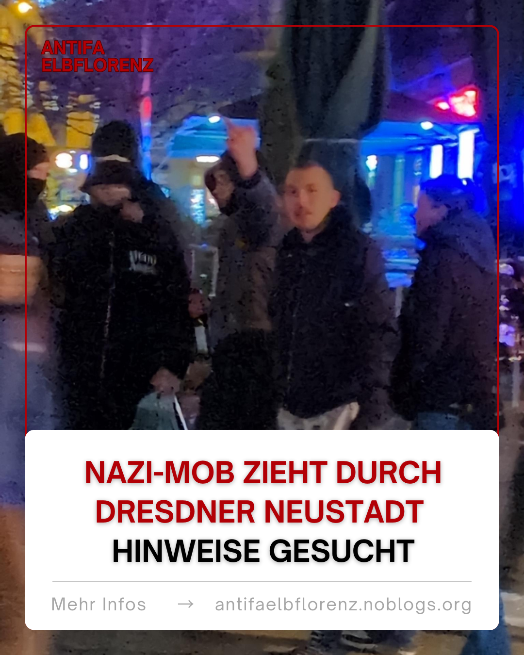 Wer Fotos oder Videos vom Vorfall oder von den Neonazis hat oder weiß, wer daran beteiligt war, kann uns diese per Instagram (@antifa_elbflorenz) oder Mail (antifa-elbflorenz[at]systemli.org) zuschicken.