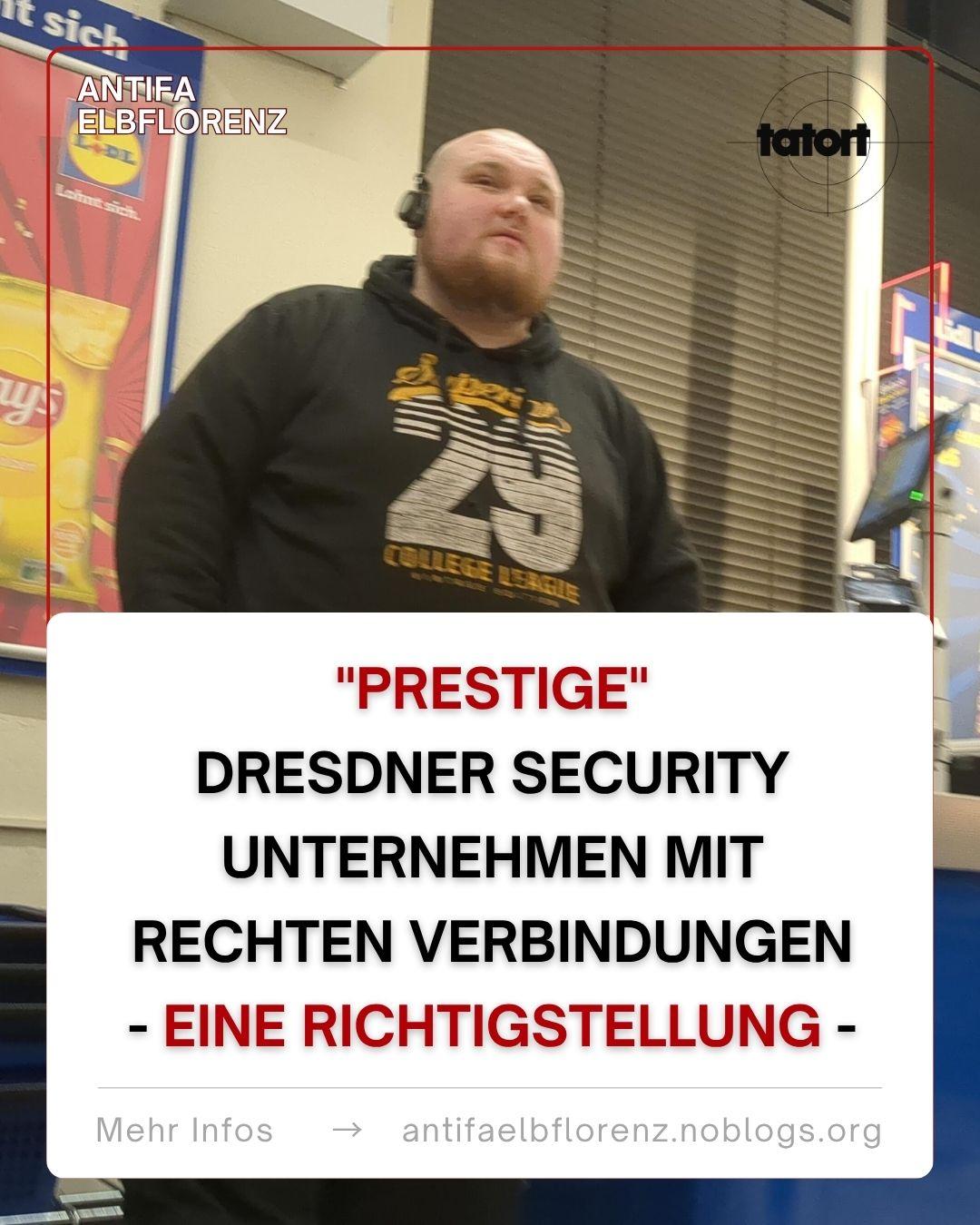 „Prestige Solution“ ist dagegen eine jüngere Security-Firma aus Dresden, die in verschiedenen Bereichen von Events bis Privatdetektei tätig ist. Die Firma fiel bisher nicht durch sichtbare Verbindungen in rechte bis neonazistische Kreise in Dresden auf, lässt aber dennoch einen Neonazi wie Leon Heckmann bei sich als Sicherheitskraft arbeiten. „Prestige Solution“ versucht sich als seriöser Security-Anbieter in Dresden zu etablieren. Die Referenzen der Website zeigen, dass die Firma für Supermärkte wie LIDL oder ALDI, aber auch die Baufirma des rechten Bautzner Unternehmers Jörg Drews „Hentschke Bau“ tätig ist. Wir fordern auch „Prestige Solution“ auf, Heckmann zu entlassen und die Auftraggeber zu prüfen, ob sie Firmen ohne neonazistische Mitarbeitende finden.
